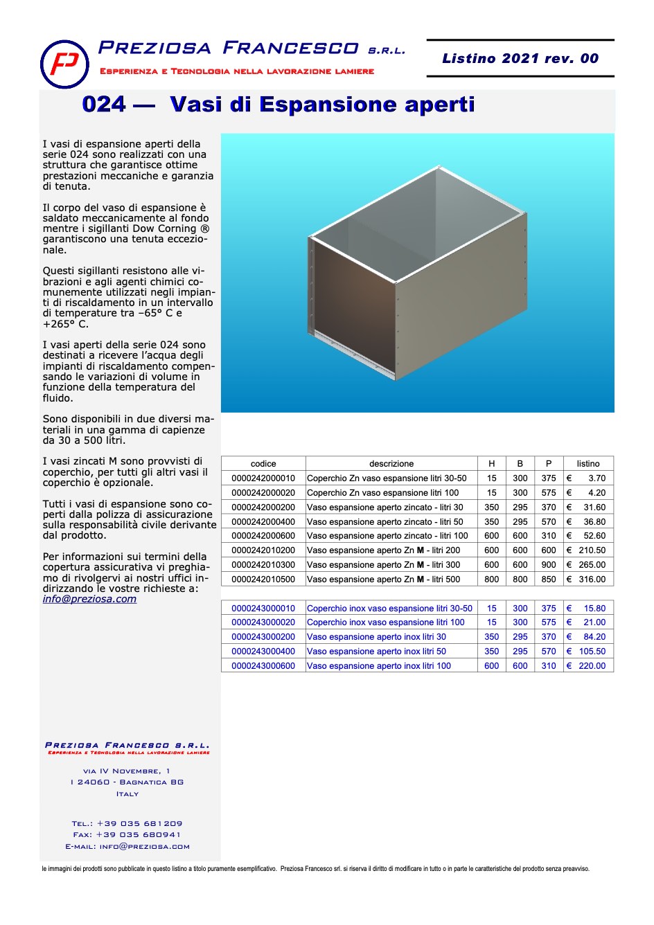 Lista de precios Preziosa Francesco Vasi di espansione aperti