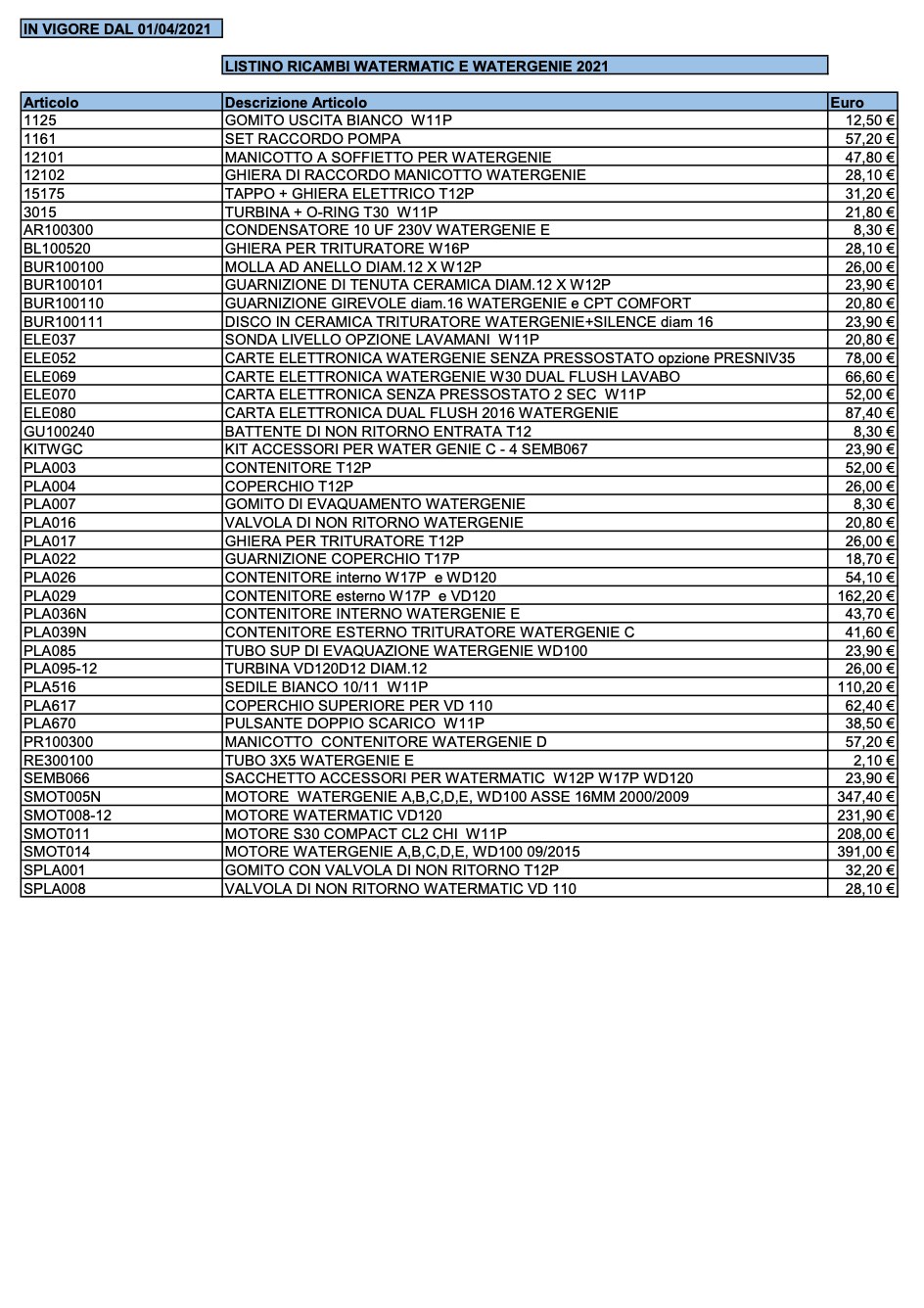 Listino prezzi Sfa - Riservato RICAMBI WATERMATIC 2021