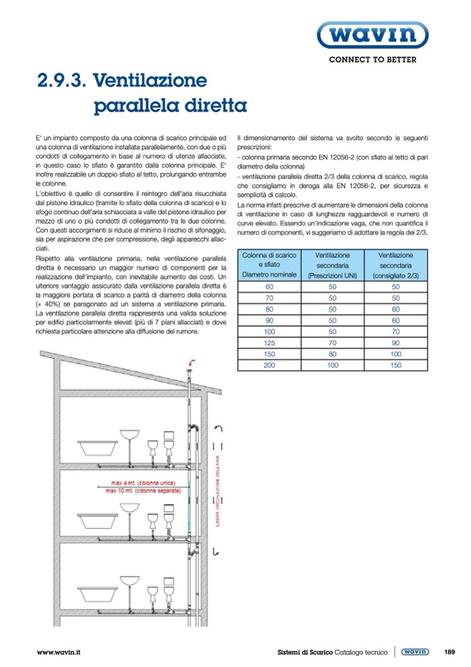 - ventilazione parallela diretta 2/3 della colonna di scarico, regola