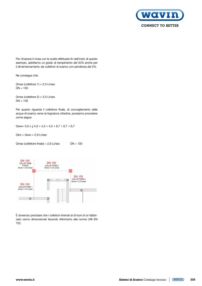 il dimensionamento dei collettori di scarico con pendenza del 2%.