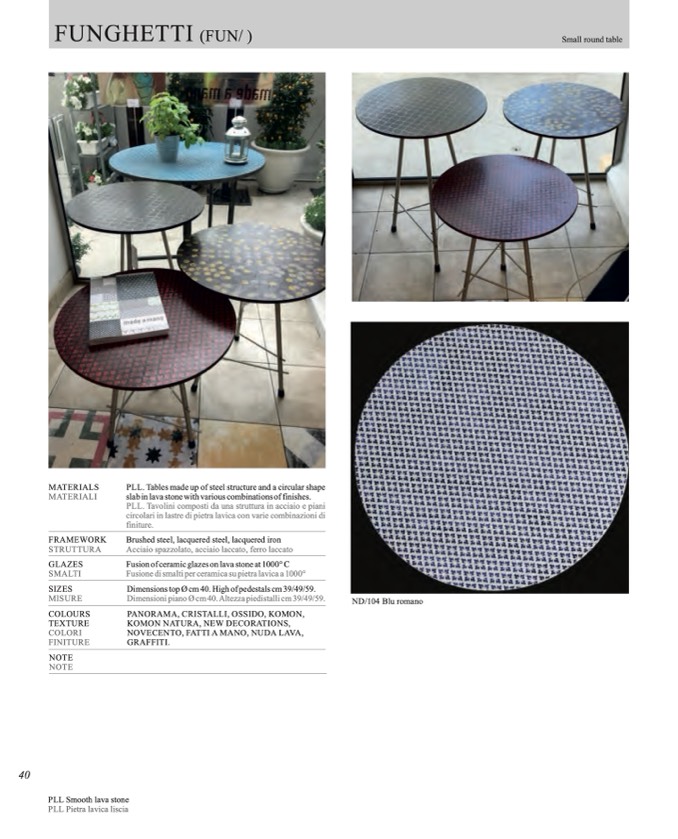 Dimensioni piano Ø cm 40. Altezza piedistalli cm 39/49/59.