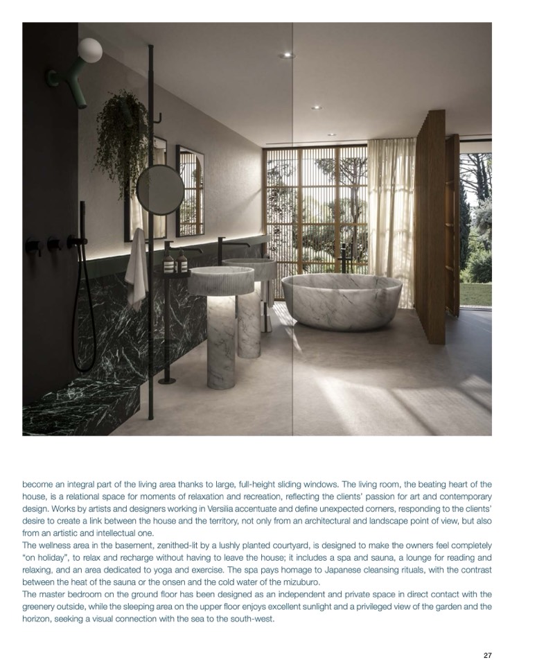 “on holiday”, to relax and recharge without having to leave the house; it includes a spa and sauna, a lounge for reading and