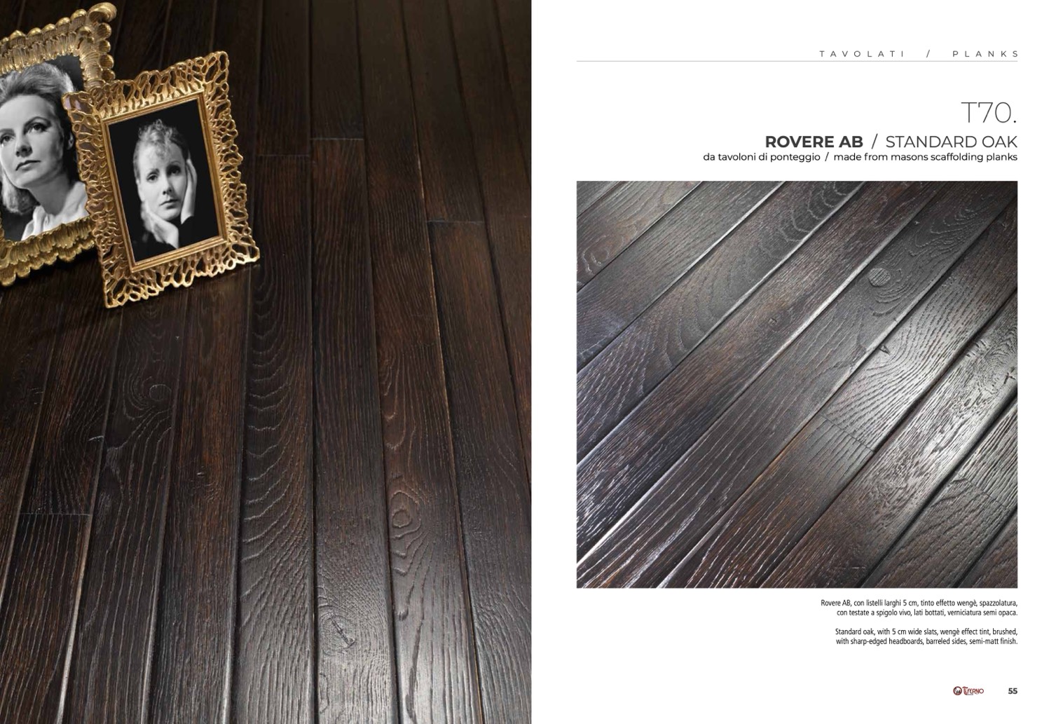 Rovere AB, con listelli larghi 5 cm, tinto effetto wengè, spazzolatura,