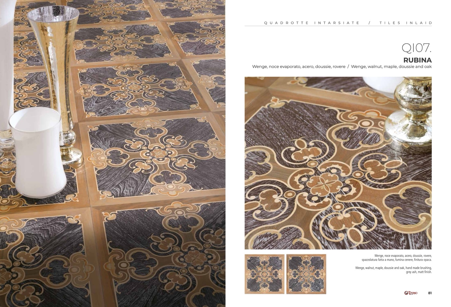 Wenge, noce evaporato, acero, doussie, rovere / Wenge, walnut, maple, doussie and oak