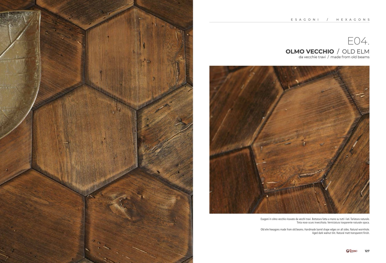 Esagoni in olmo vecchio ricavato da vecchi travi. Bottatura fatta a mano su tutti i lati. Tarlatura naturale.