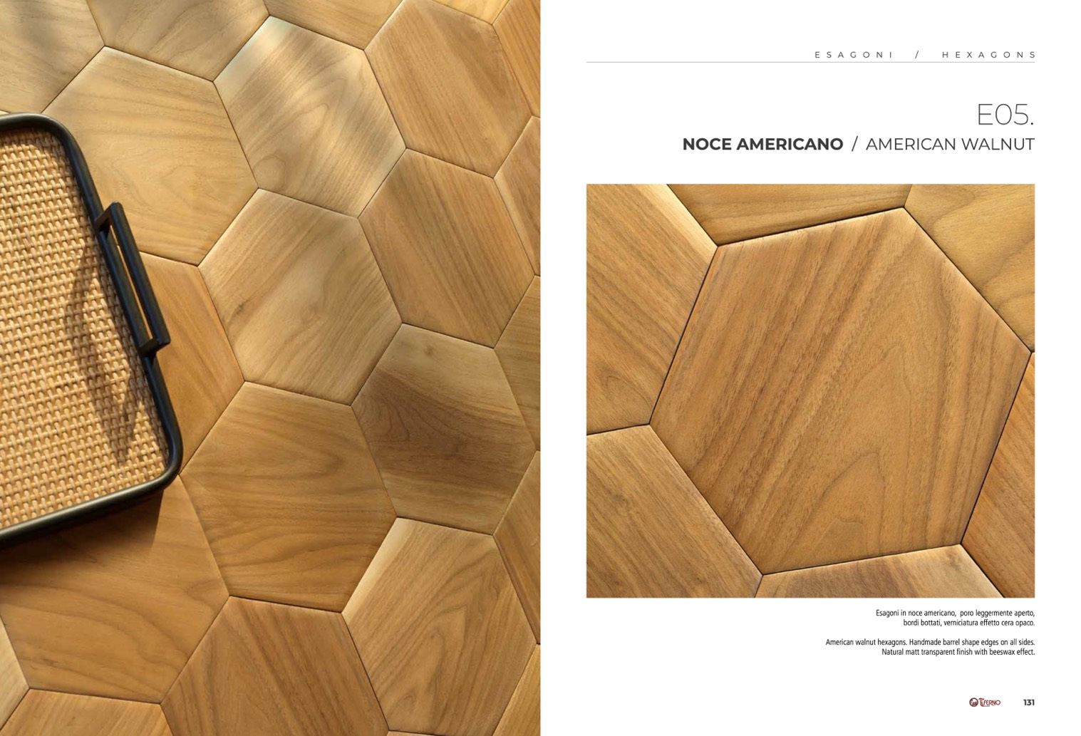 American walnut hexagons. Handmade barrel shape edges on all sides.