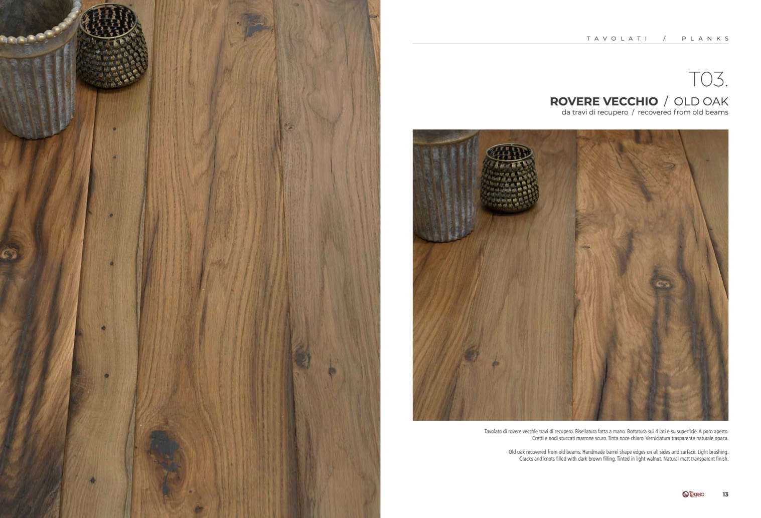 Tavolato di rovere vecchie travi di recupero. Bisellatura fatta a mano. Bottatura sui 4 lati e su superficie. A poro aperto.