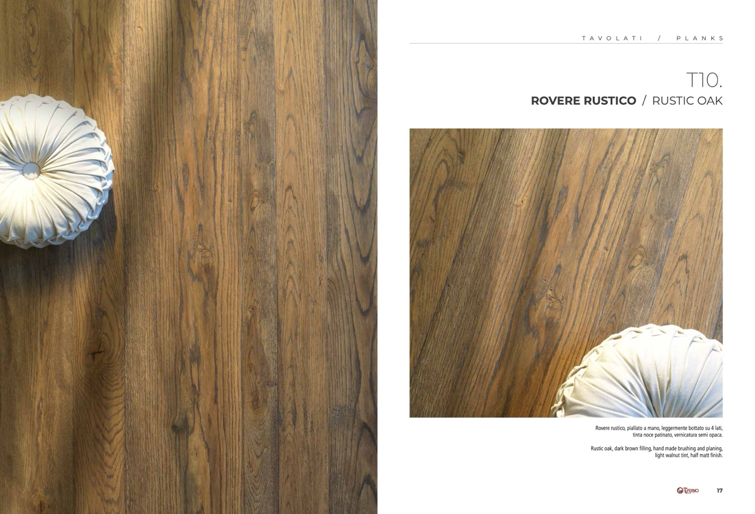 Rustic oak, dark brown filling, hand made brushing and planing,