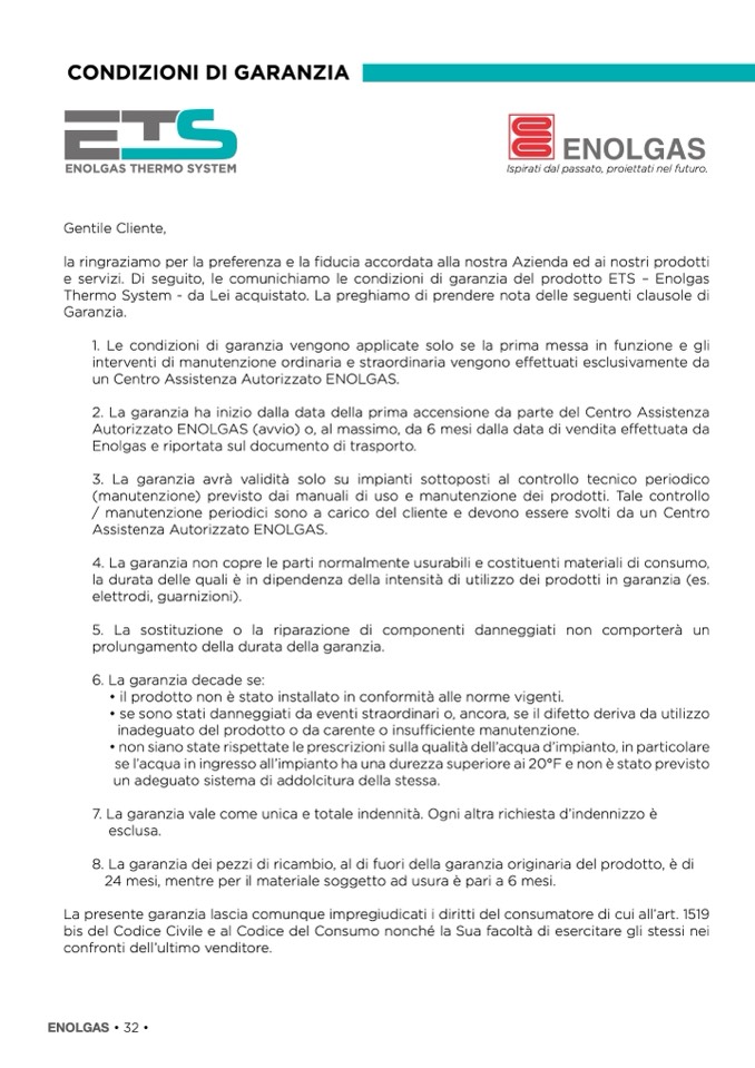 e servizi. Di seguito, le comunichiamo le condizioni di garanzia del prodotto ETS – Enolgas