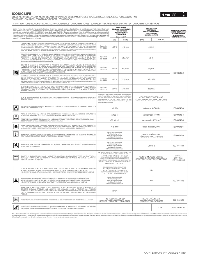 dalla norma EN 14411-ISO 13006 Appendice G gruppo BIa UGL/ Unglazed porcelain stoneware slabs. Dry-pressed ceramic tiles. Quality specifications,