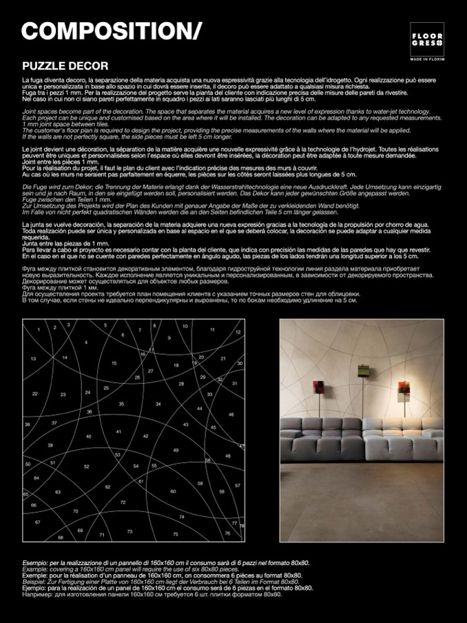 Die Fuge wird zum Dekor; die Trennung der Materie erlangt dank der Wasserstrahltechnologie eine neue Ausdruckkraft. Jede Umsetzung kann einzigartig