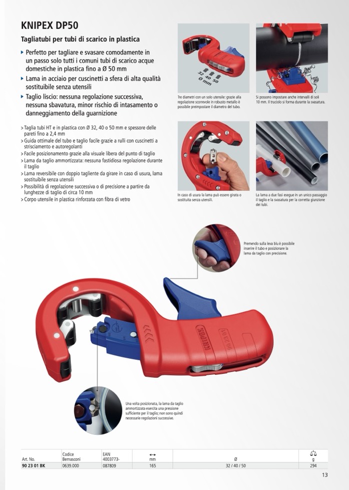 > Taglia tubi HT e in plastica con Ø 32, 40 o 50 mm e spessore delle