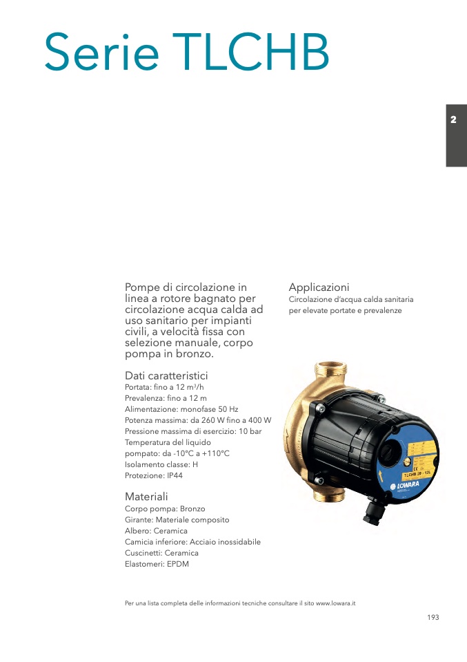 Per una lista completa delle informazioni tecniche consultare il sito www.lowara.it