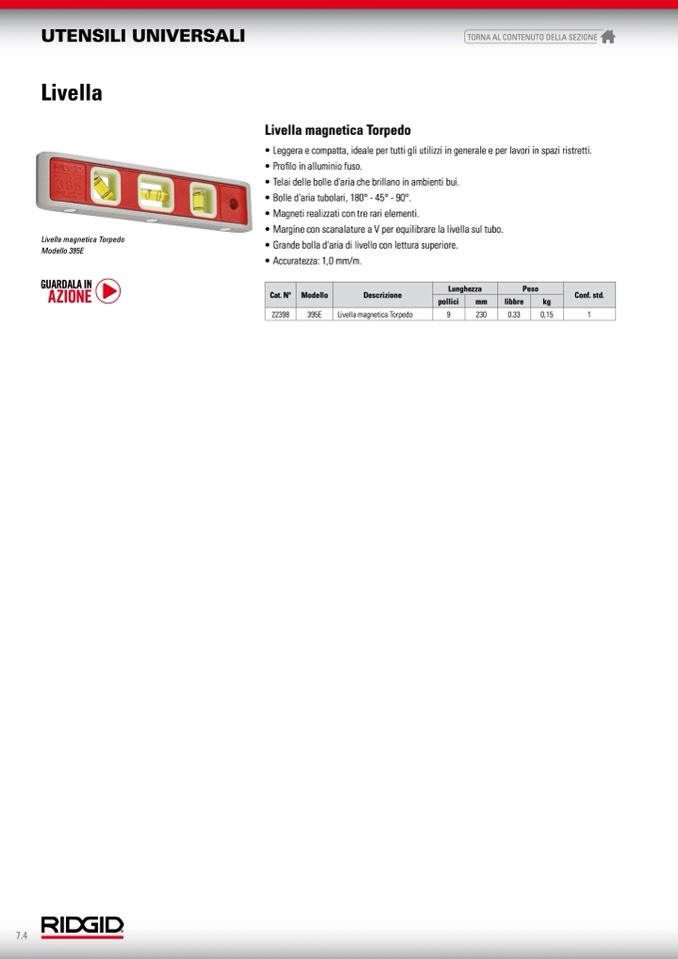 • Margine con scanalature a V per equilibrare la livella sul tubo.