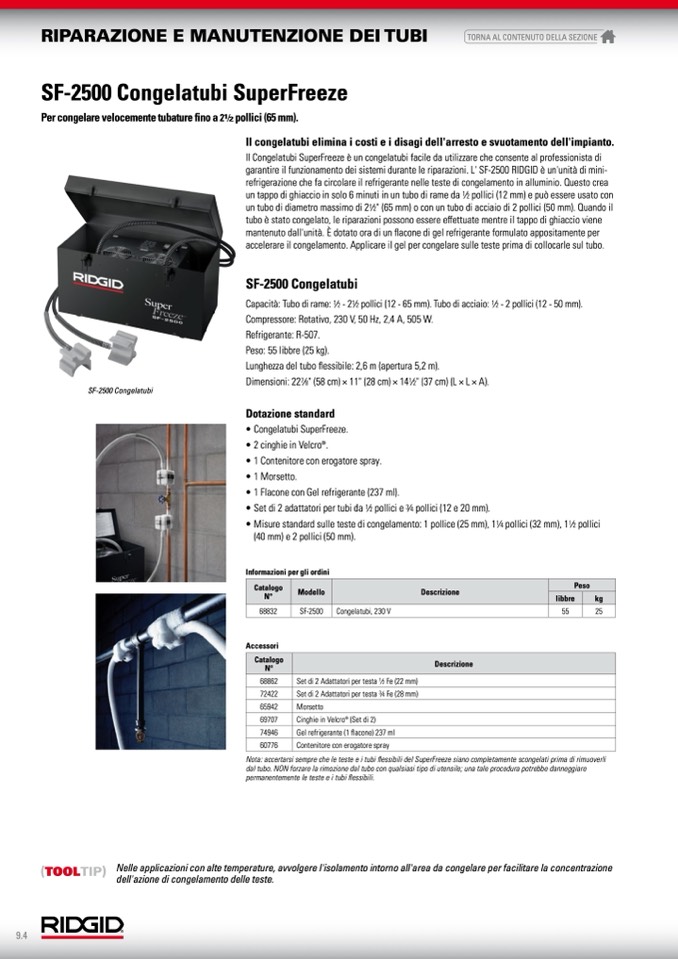 Per congelare velocemente tubature fino a 21⁄2 pollici (65 mm).