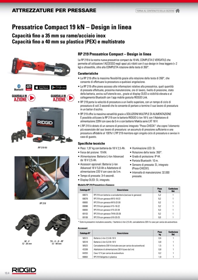* Tutte le pressatrici includono cassetta, 1 batteria Li-Ion 2,5 Ah, caricabatteria 230 V e cavo per carica da autovettura.