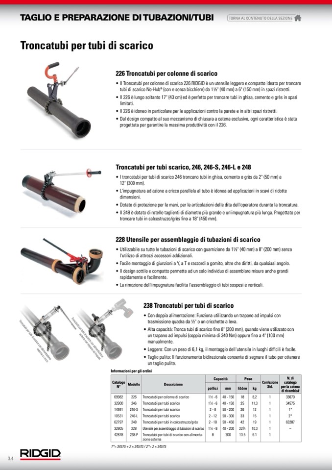 • I troncatubi per tubi di scarico 246 troncano tubi in ghisa, cemento o grès da 2" (50 mm) a