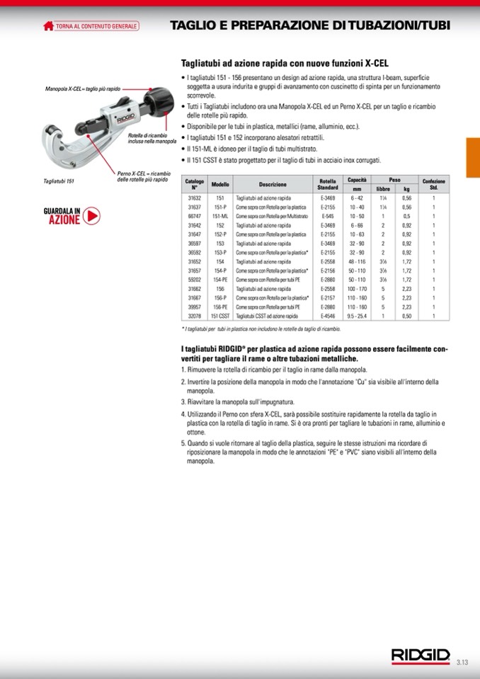 • Tutti i Tagliatubi includono ora una Manopola X-CEL ed un Perno X-CEL per un taglio e ricambio