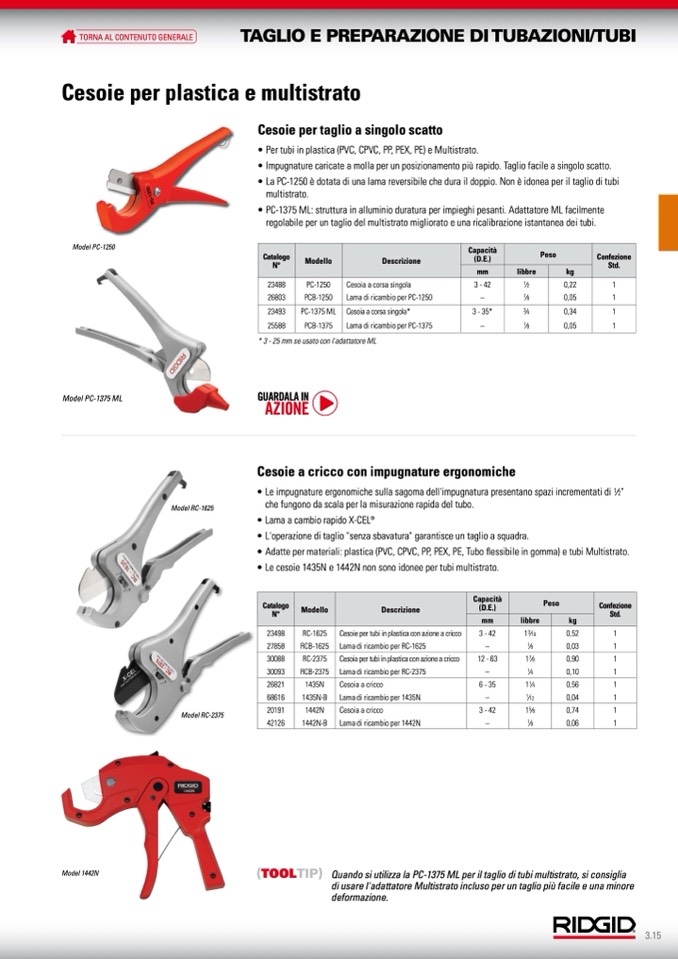 • Le cesoie 1435N e 1442N non sono idonee per tubi multistrato.
