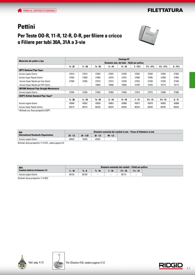 Diametro nominale dei conduit in mm – Passo di filettature in mm