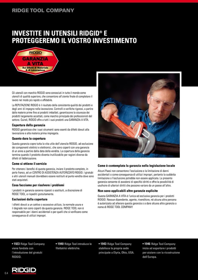 settore. Quindi, RIDGID offre a tutti i suoi prodotti una GARANZIA A VITA.
