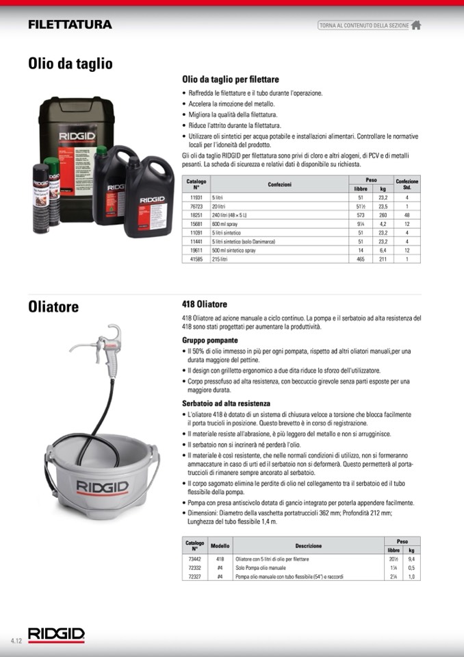 Gli oli da taglio RIDGID per filettatura sono privi di cloro e altri alogeni, di PCV e di metalli