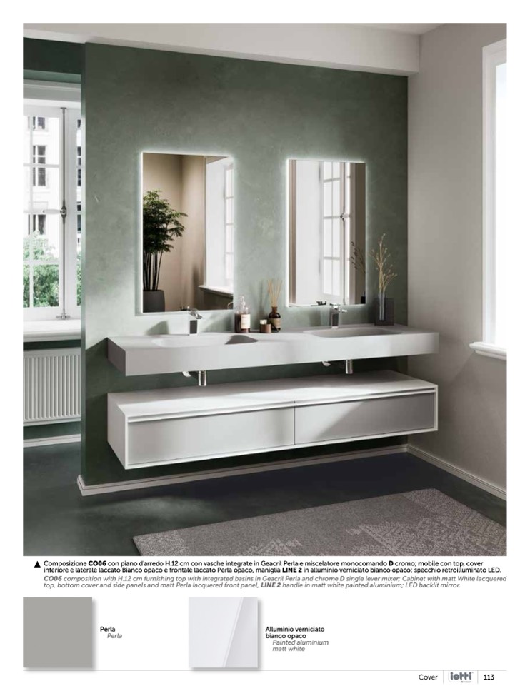 inferiore e laterale laccato Bianco opaco e frontale laccato Perla opaco, maniglia LINE 2 in alluminio verniciato bianco opaco; specchio retroilluminato LED.