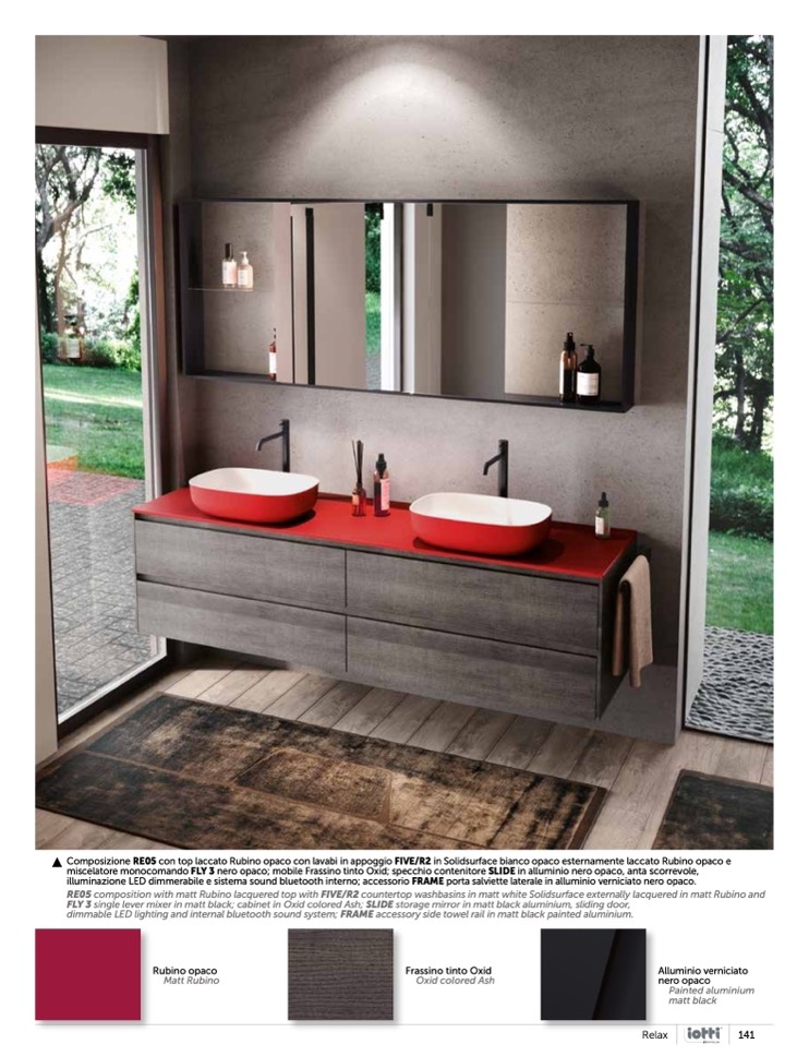RE05 composition with matt Rubino lacquered top with FIVE/R2 countertop washbasins in matt white Solidsurface externally lacquered in matt Rubino and