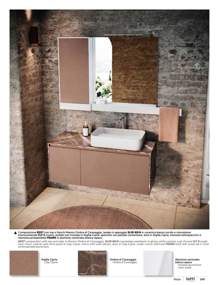 RE07 composition with top and sides in Marmo Ombra di Caravaggio, SLIM 60/A countertop washbasin in glossy white ceramic and chrome FLY 3 single