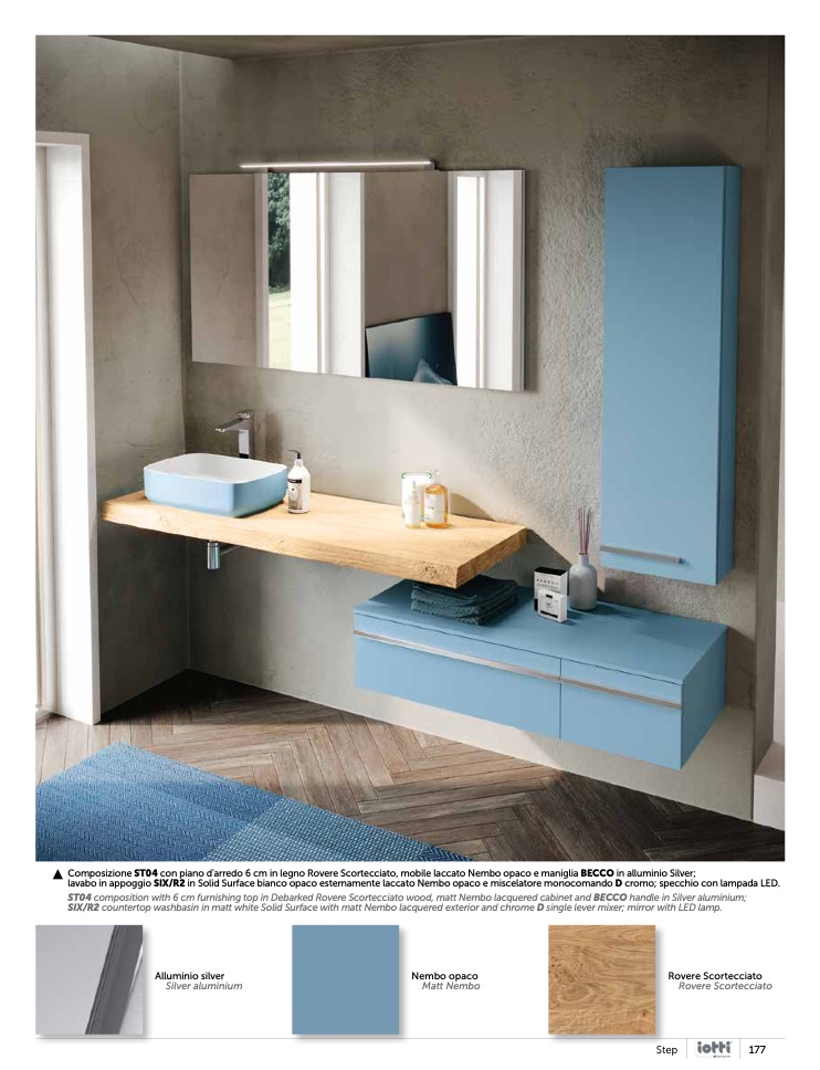 ST04 composition with 6 cm furnishing top in Debarked Rovere Scortecciato wood, matt Nembo lacquered cabinet and BECCO handle in Silver aluminium;