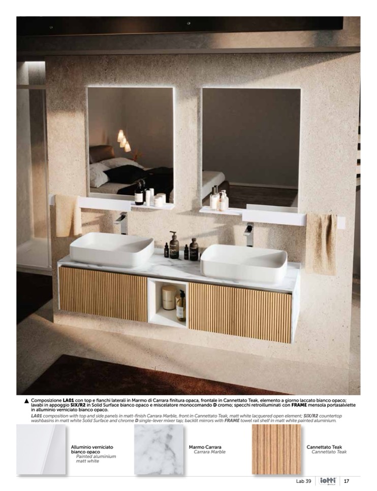 Composizione LA01 con top e fianchi laterali in Marmo di Carrara finitura opaca, frontale in Cannettato Teak, elemento a giorno laccato bianco opaco;