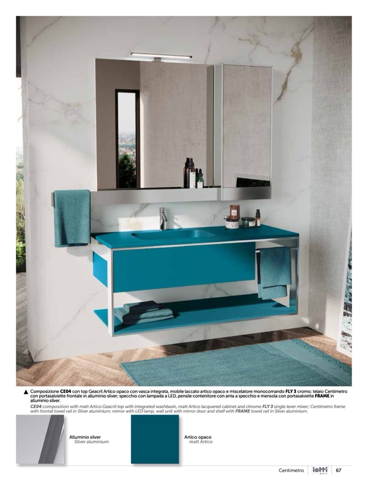 CE04 composition with matt Artico Geacril top with integrated washbasin, matt Artico lacquered cabinet and chrome FLY 3 single lever mixer; Centimetro frame