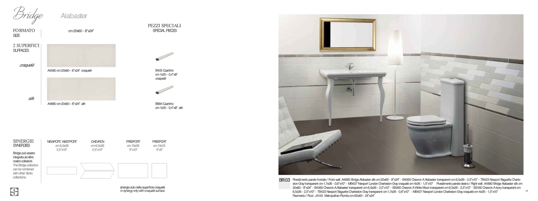 Rivestimento parete frontale / Front wall: A4880 Bridge Alabaster silk cm 20x60 - 8”x24” - B4060 Chevron A Alabaster transparent cm 6,5x26 - 2,5”x10” - TB423 Newport Baguette Charle-