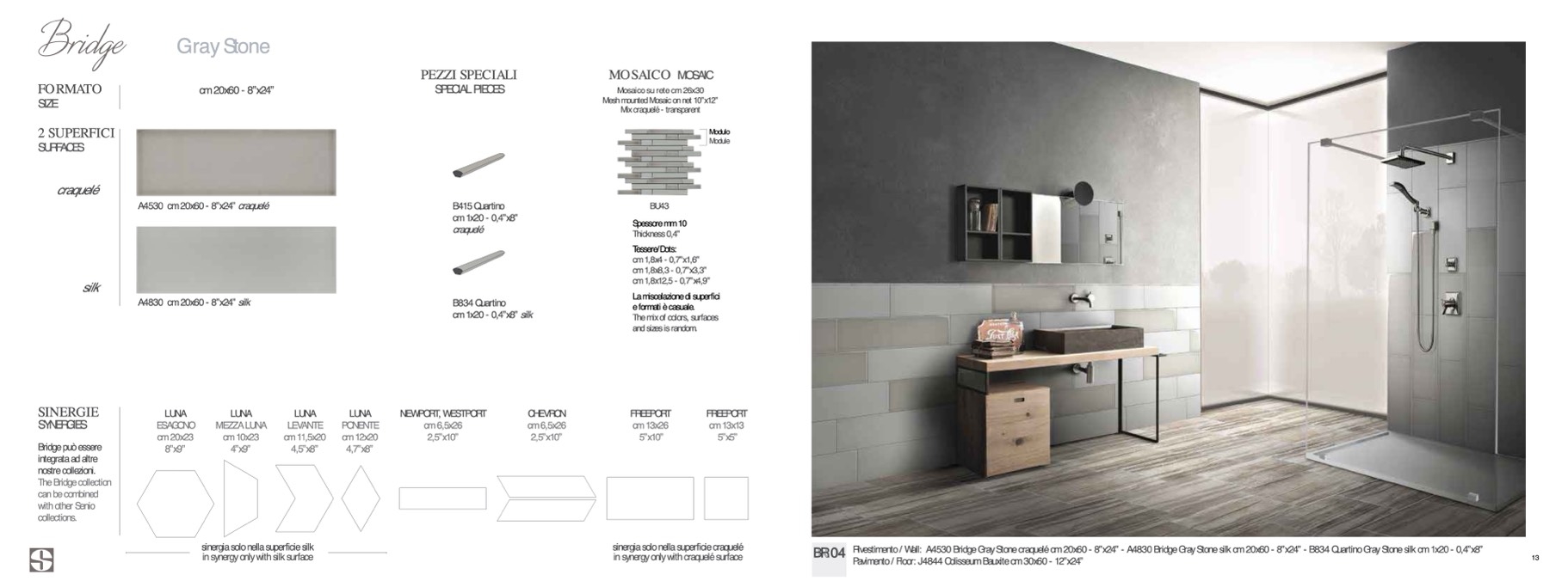 Rivestimento / Wall: A4530 Bridge Gray Stone craquelé cm 20x60 - 8”x24” - A4830 Bridge Gray Stone silk cm 20x60 - 8”x24” - B834 Quartino Gray Stone silk cm 1x20 - 0,4”x8”
