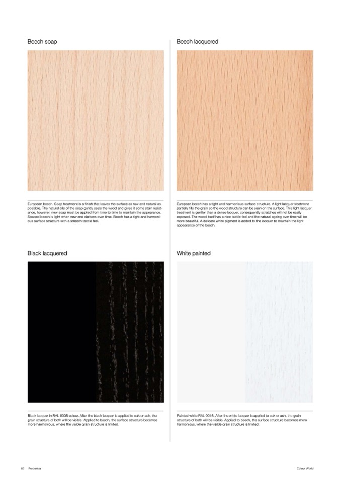 Painted white RAL 9016. After the white lacquer is applied to oak or ash, the grain