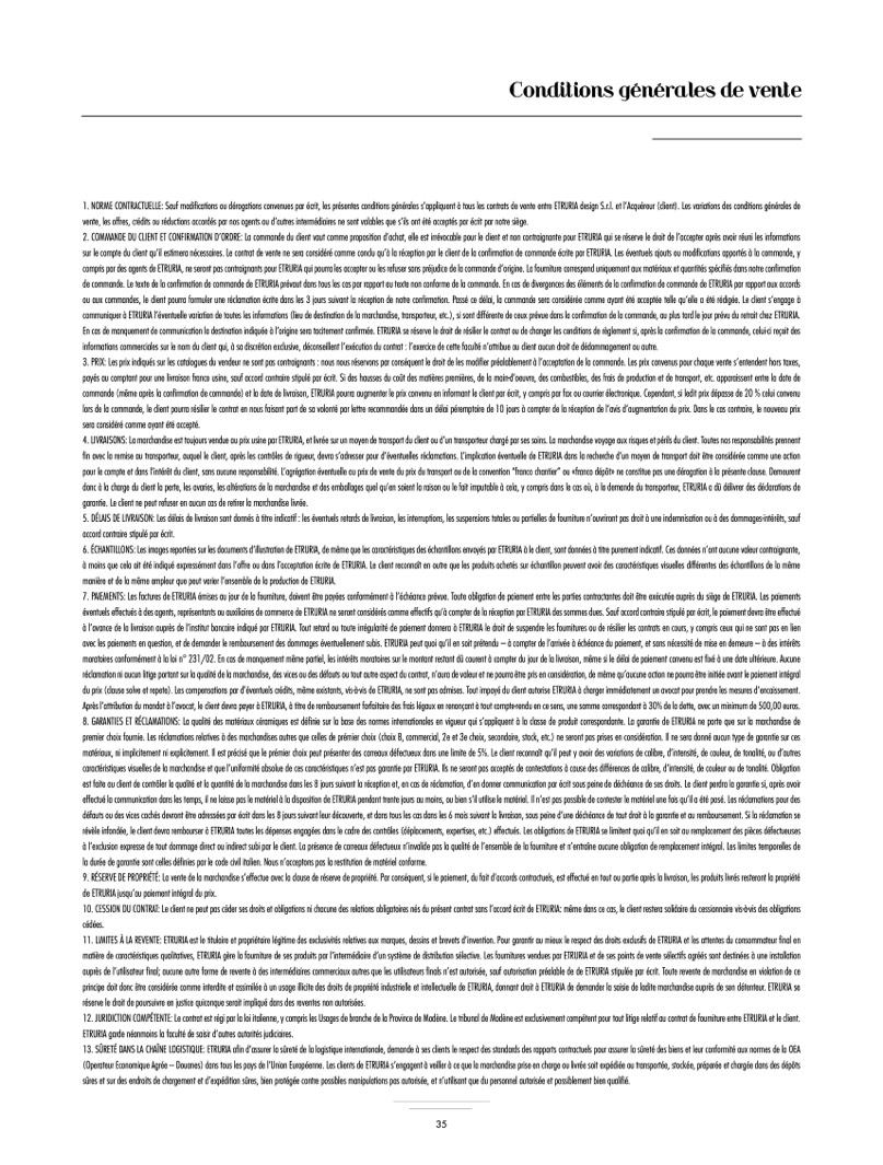6. ÉCHANTILLONS: Les images reportées sur les documents d’illustration de ETRURIA, de même que les caractéristiques des échantillons envoyés par ETRURIA à le client, sont données à titre purement indicatif. Ces données n’ont aucune valeur contraignante,