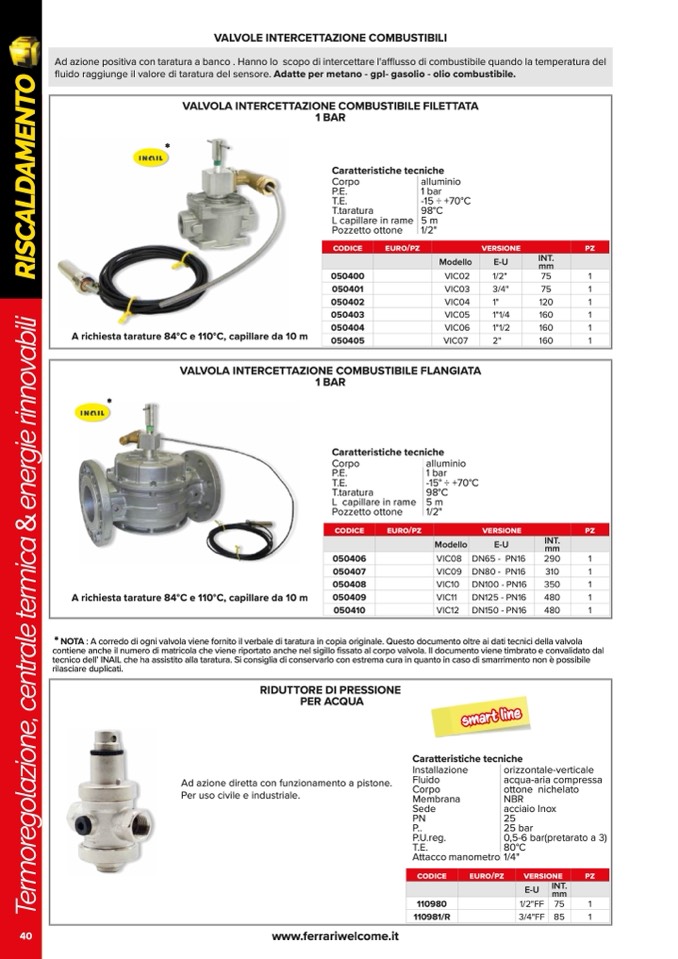* NOTA : A corredo di ogni valvola viene fornito il verbale di taratura in copia originale. Questo documento oltre ai dati tecnici della valvola