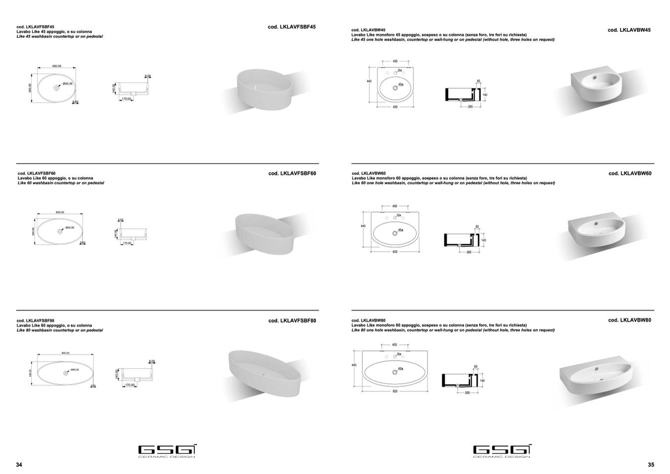 Like 45 one hole washbasin, countertop or wall-hung or on pedestal (without hole, three holes on request)