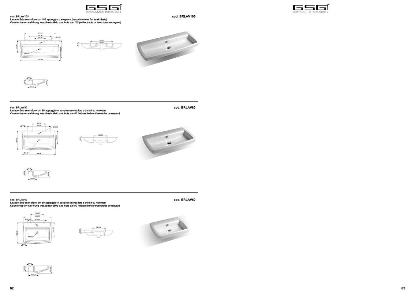 Lavabo Brio monoforo cm 60 appoggio o sospeso (senza foro o tre fori su richiesta)