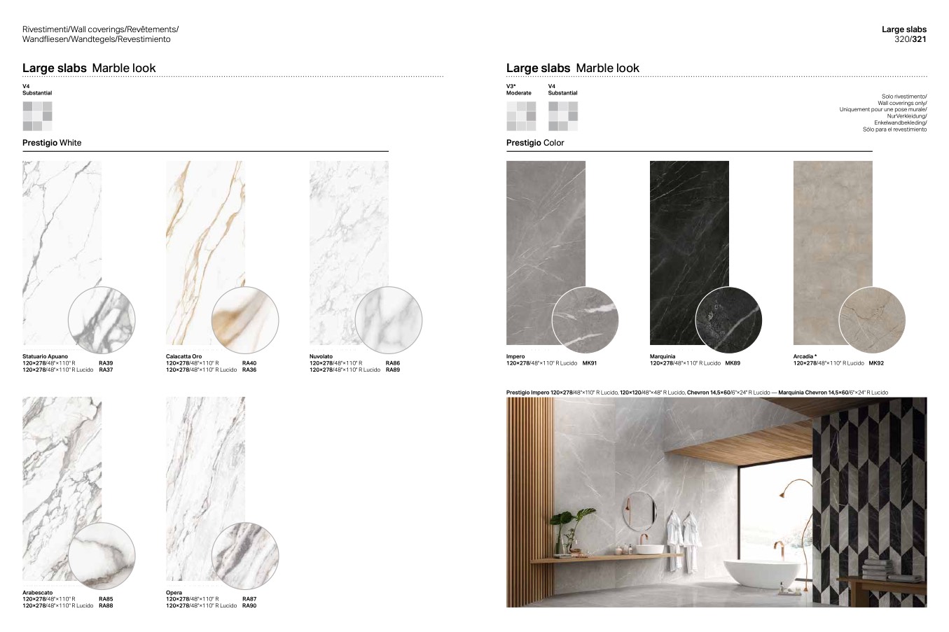 Prestigio Impero 120×278/48"×110" R Lucido, 120×120/48"×48" R Lucido, Chevron 14,5×60/6"×24" R Lucido — Marquinia Chevron 14,5×60/6"×24" R Lucido
