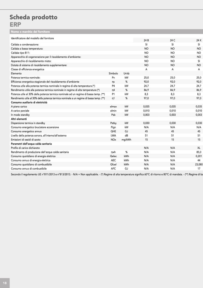 Secondo il regolamento UE n°811/2013 e n°813/2013. - N/A = Non applicabile. - (*) Regime di alta temperatura significa 60°C di ritorno e 80°C di mandata. - (**) Regime di b