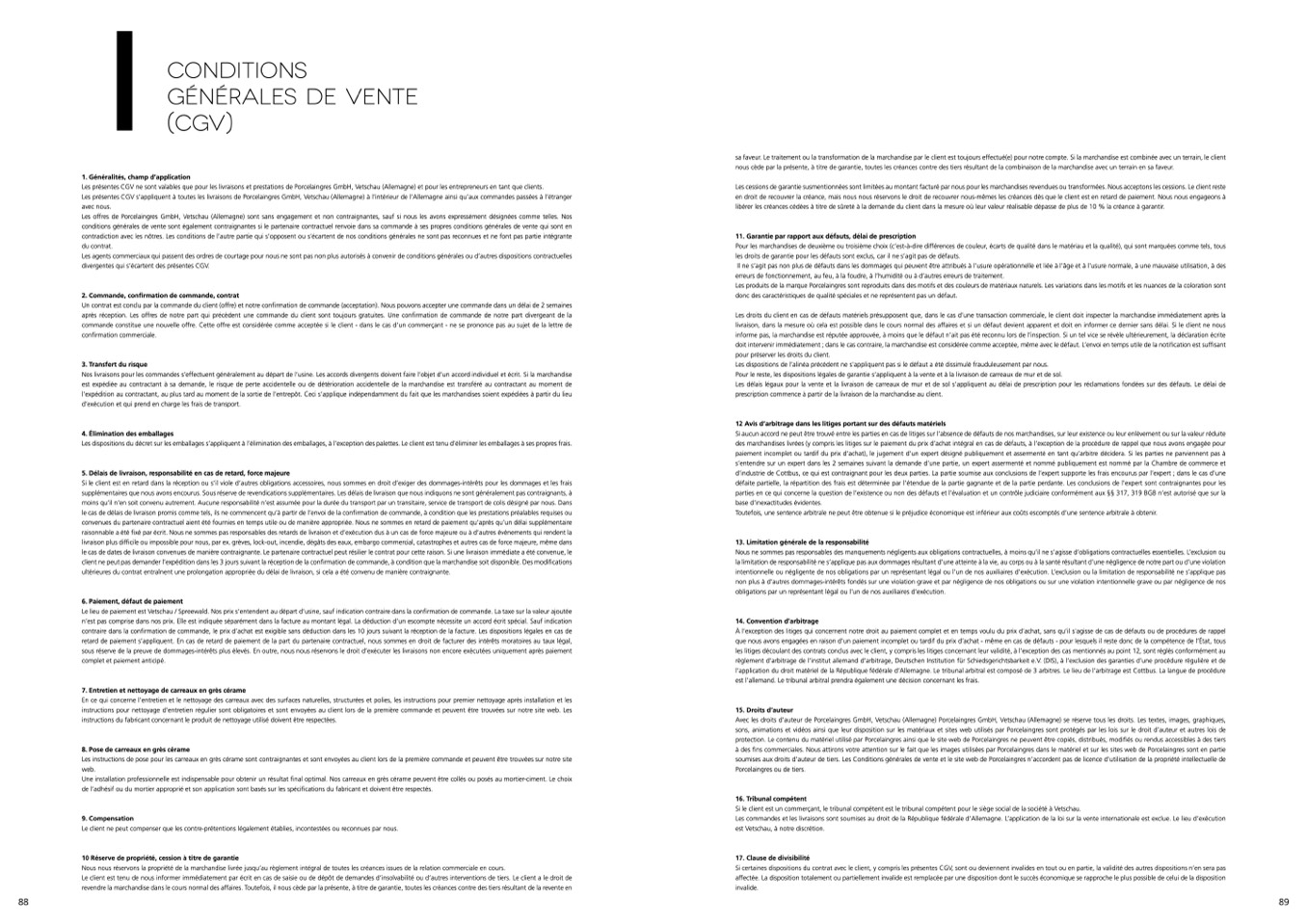 Les présentes CGV ne sont valables que pour les livraisons et prestations de Porcelaingres GmbH, Vetschau (Allemagne) et pour les entrepreneurs en tant que clients.