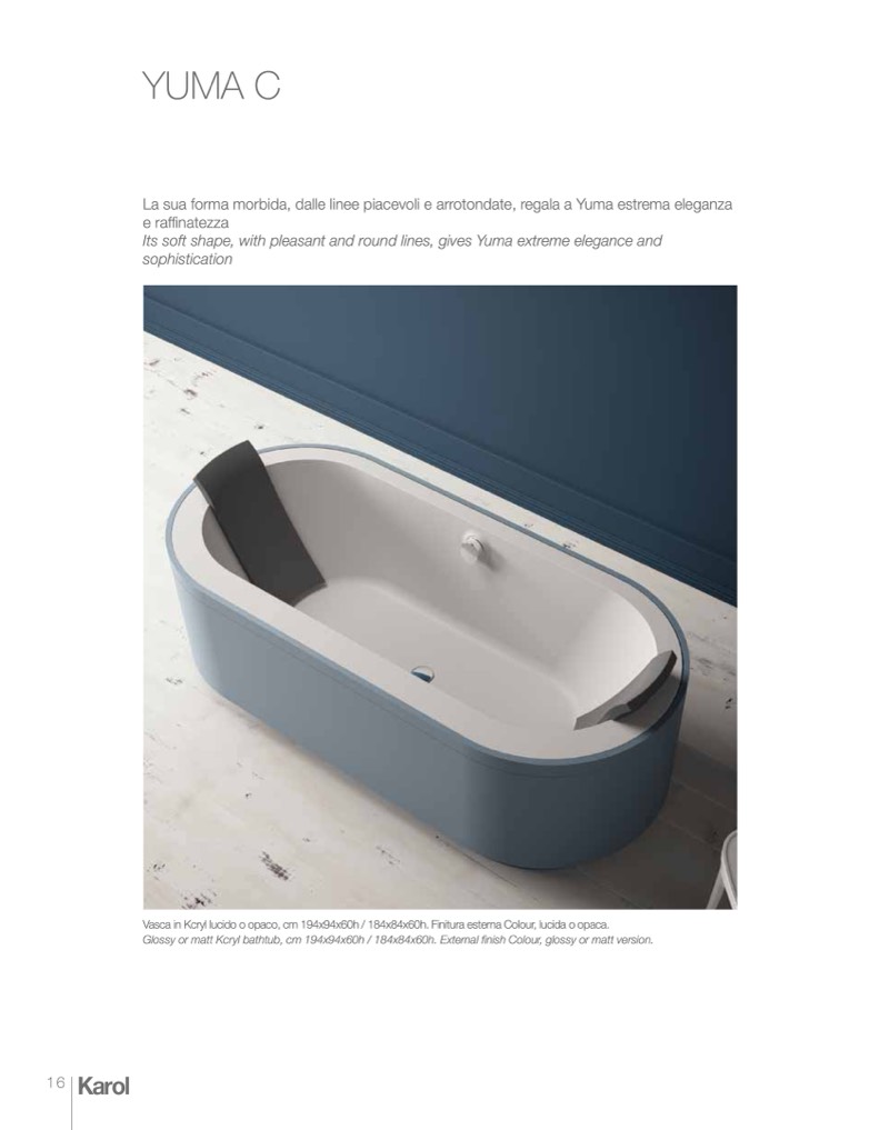 Glossy or matt Kcryl bathtub, cm 194x94x60h / 184x84x60h. External finish Colour, glossy or matt version.