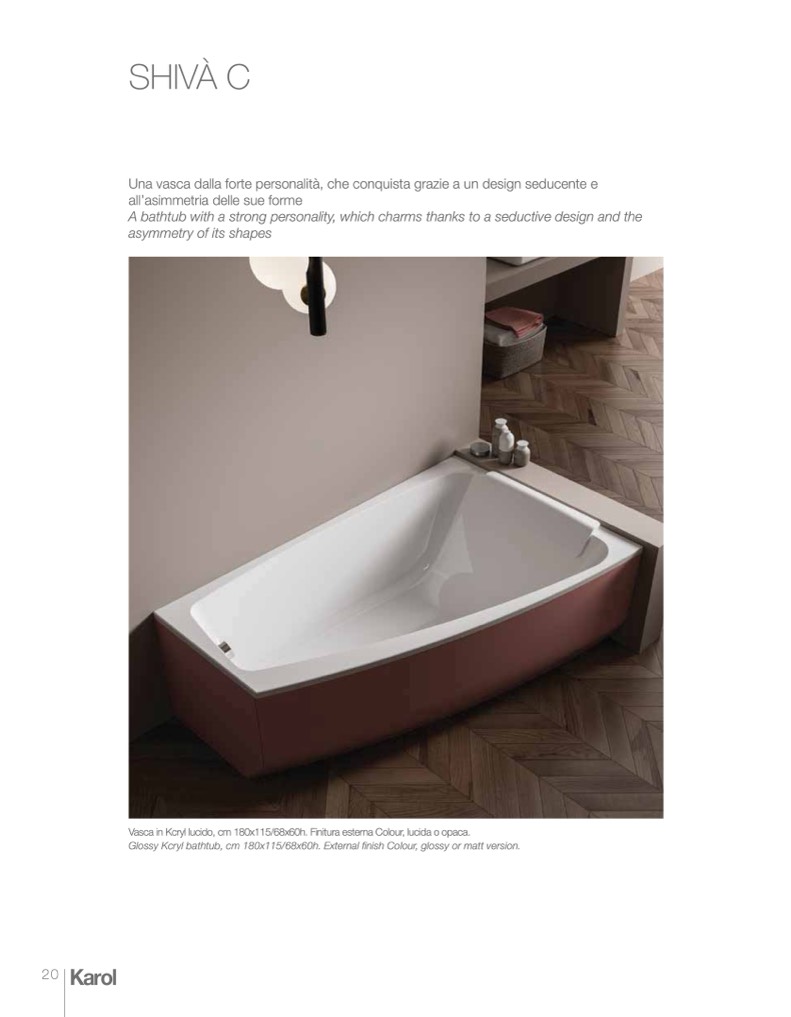 Glossy Kcryl bathtub, cm 180x115/68x60h. External finish Colour, glossy or matt version.