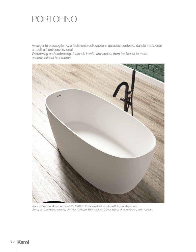 Glossy or matt Kstone bathtub, cm 160x70x61,5h. External finish Colour, glossy or matt version, upon request.