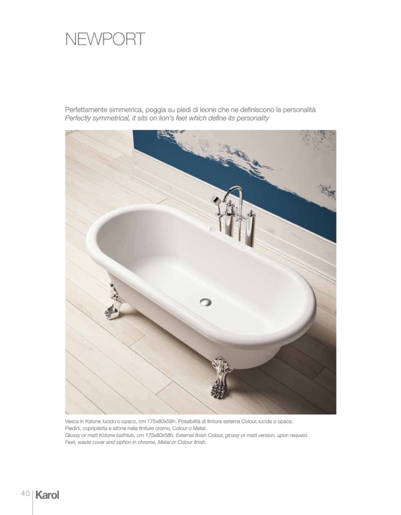 Vasca in Kstone lucido o opaco, cm 175x80x58h. Possibilità di finitura esterna Colour, lucida o opaca.