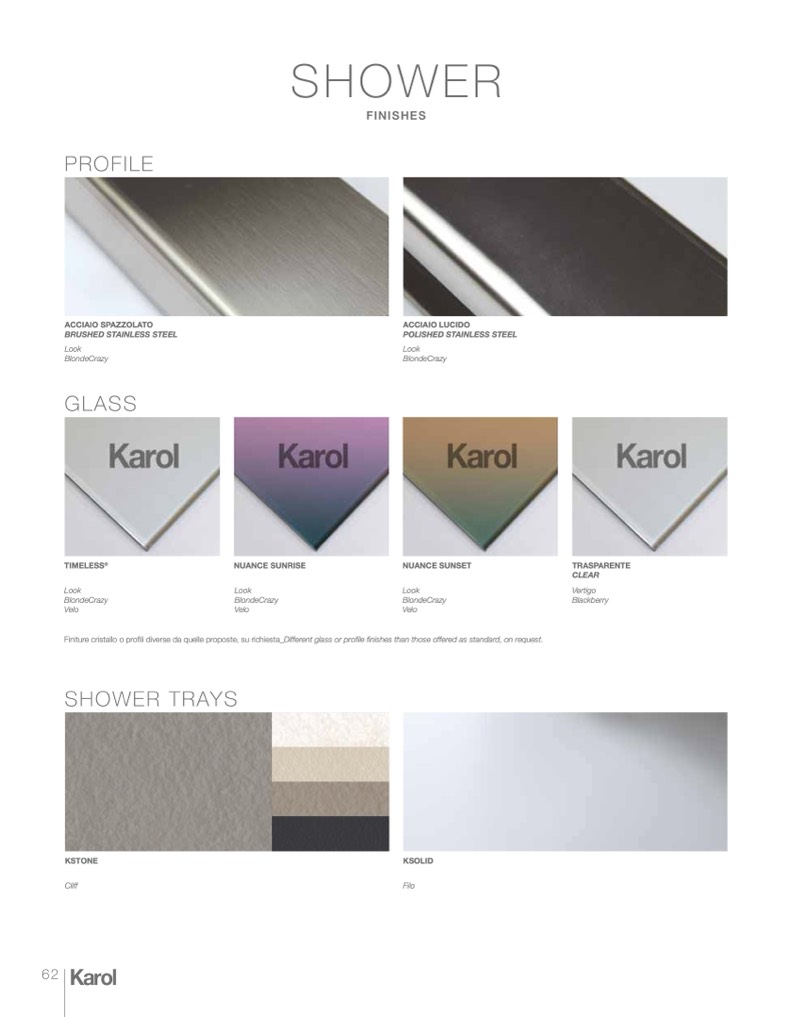 Finiture cristallo o profili diverse da quelle proposte, su richiesta_Different glass or profile finishes than those offered as standard, on request.