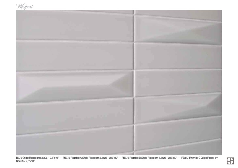 B376 Grigio Riposo cm 6,5x26 - 2,5”x10” – PB375 Piramide A Grigio Riposo cm 6,5x26 - 2,5”x10” – PB376 Piramide B Grigio Riposo cm 6,5x26 - 2,5”x10” – PB377 Piramide C Grigio Riposo cm