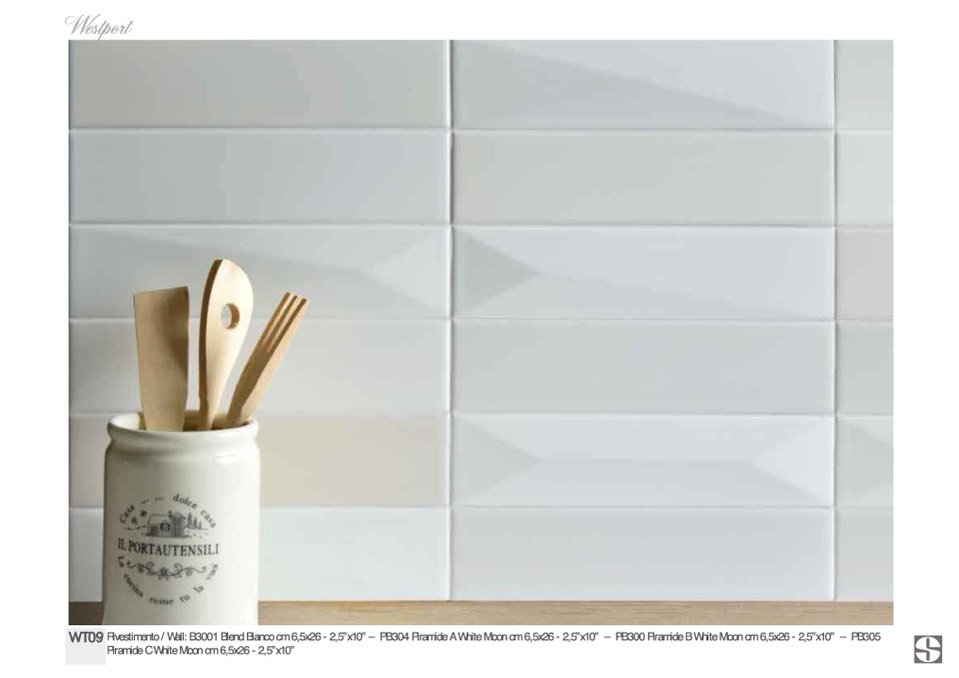 Rivestimento / Wall: B3001 Blend Bianco cm 6,5x26 - 2,5”x10” – PB304 Piramide A White Moon cm 6,5x26 - 2,5”x10” – PB300 Piramide B White Moon cm 6,5x26 - 2,5”x10” – PB305