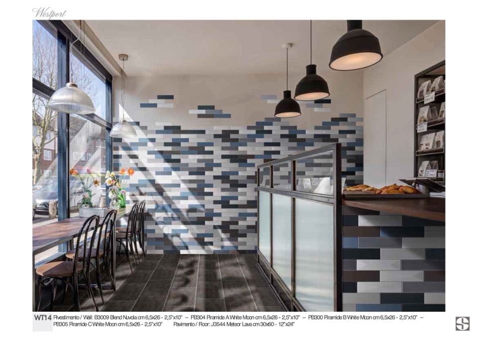 Rivestimento / Wall: B3009 Blend Nuvola cm 6,5x26 - 2,5”x10” – PB304 Piramide A White Moon cm 6,5x26 - 2,5”x10” – PB300 Piramide B White Moon cm 6,5x26 - 2,5”x10” –